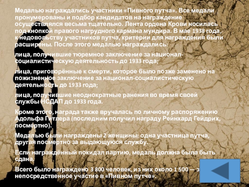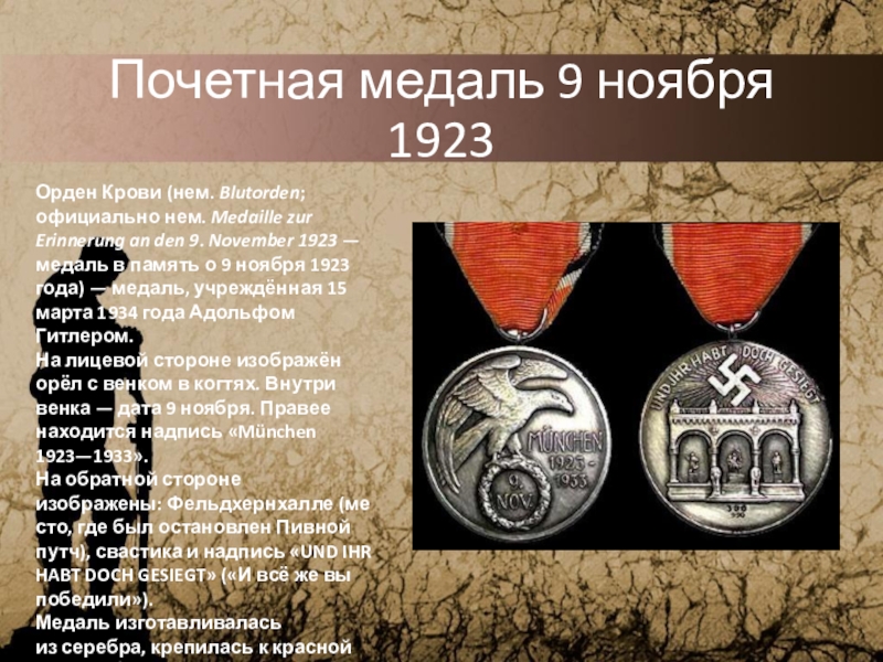 Слайд 8Медалью награждались участники «Пивного путча». Все медали пронумерованы и подбор кандидатов