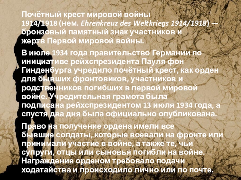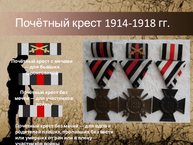 Слайд 15Почётный крест мировой войны 1914/1918 (нем. Ehrenkreuz des Weltkriegs 1914/1918) — бронзовый памятный знак