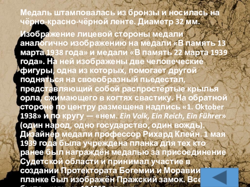 медали аналогично изображению на медали «В память 13 марта 1938 года» и медали «В память 22 марта 1939 года». На ней изображены две человеческие фигуры, одна из которых, помогает другой подняться на своеобразный пьедестал, представляющий собой распростёртые крылья орла, сжимающего в когтях свастику. На обратной стороне по центру размещена надпись «1. Oktober 1938» и по кругу — «нем. Ein Volk, Ein Reich, Ein Führer» (один народ, одно государство, один вождь). Дизайнер медали профессор Рихард Клейн. 1 мая 1939 года была учреждена планка для тех кто ранее был награждён медалью за присоединение Судетской области и принимал участие в создании Протектората Богемии и Моравии. На планке был изображён Пражский замок. Всего было вручено 134563 планки.