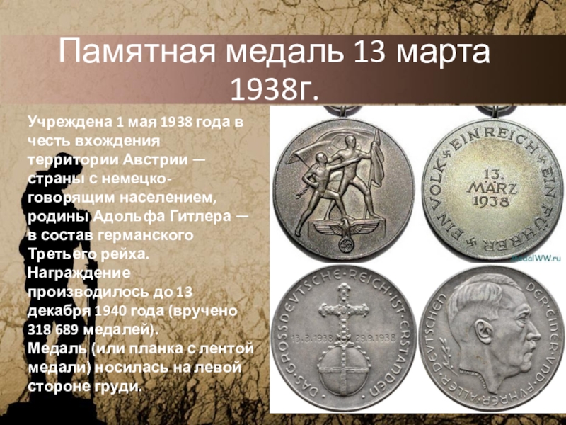 На реверсе медали — расположенное в центре изображение государственного герба и дата: нем. 13. MÄRZ 1938 — «13 марта 1938 года».