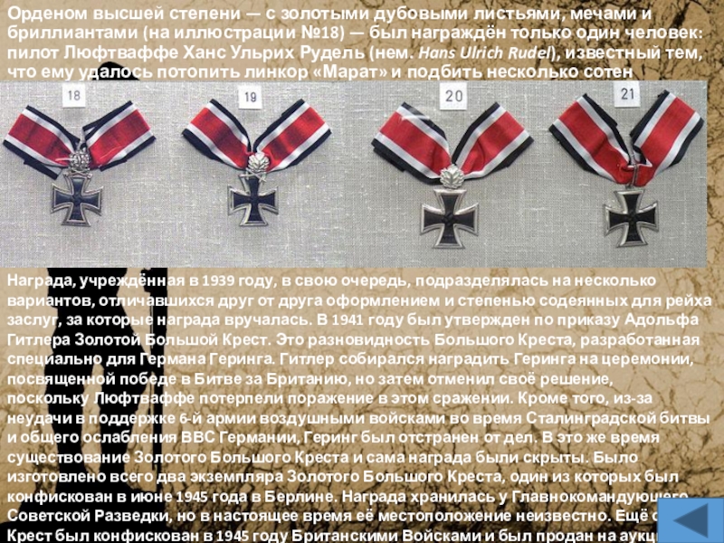 иллюстрации №18) — был награждён только один человек: пилот Люфтваффе Ханс Ульрих Рудель (нем. Hans Ulrich Rudel), известный тем, что ему удалось потопить линкор «Марат» и подбить несколько сотен советских танков.