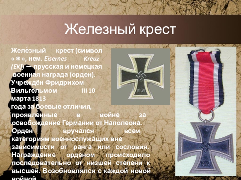 Желе́зный крест (символ «✠», нем. Eisernes Kreuz (EK)) — прусская и немецкая военная награда (орден).
