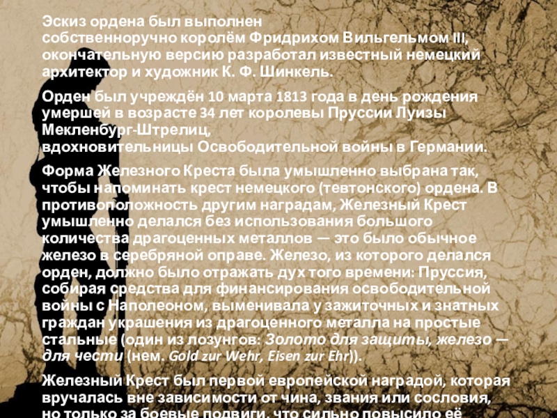 Слайд 20Эскиз ордена был выполнен собственноручно королём Фридрихом Вильгельмом III, окончательную версию разработал известный