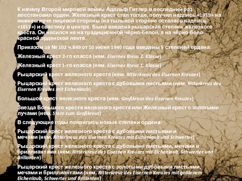 Слайд 22К началу Второй мировой войны Адольф Гитлер в последний раз восстановил орден. Железный крест