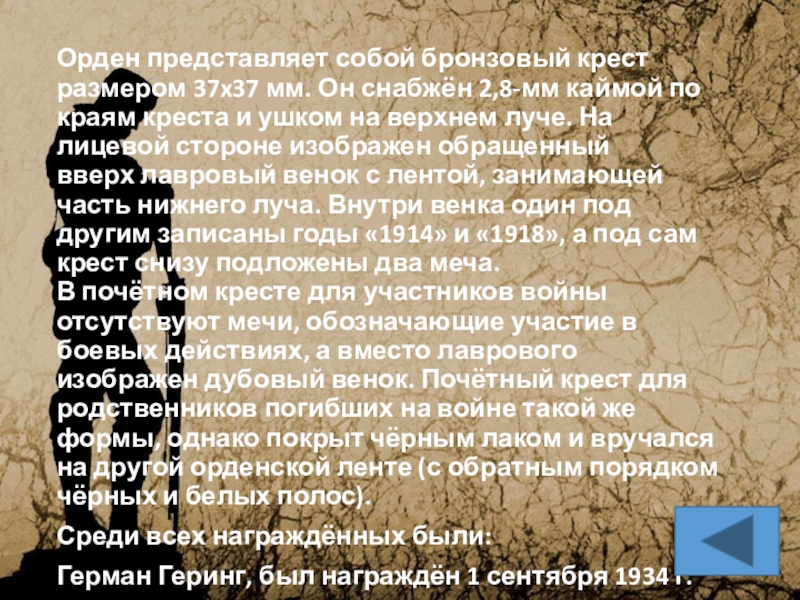 Слайд 16Орден представляет собой бронзовый крест размером 37x37 мм. Он снабжён 2,8-мм каймой