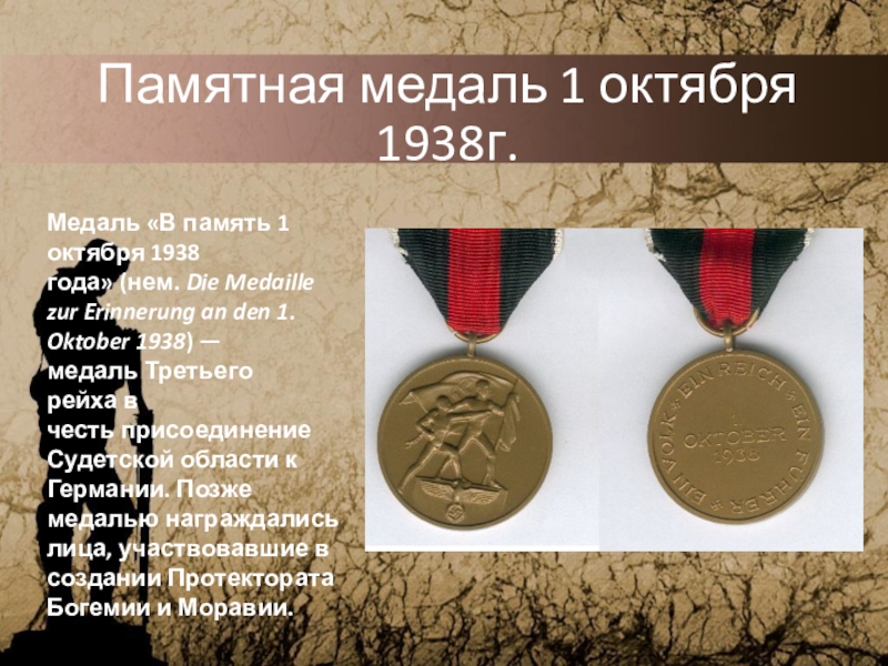 Medaille zur Erinnerung an den 1. Oktober 1938) — медаль Третьего рейха в честь присоединение Судетской области к Германии. Позже медалью награждались лица, участвовавшие в создании Протектората Богемии и Моравии.