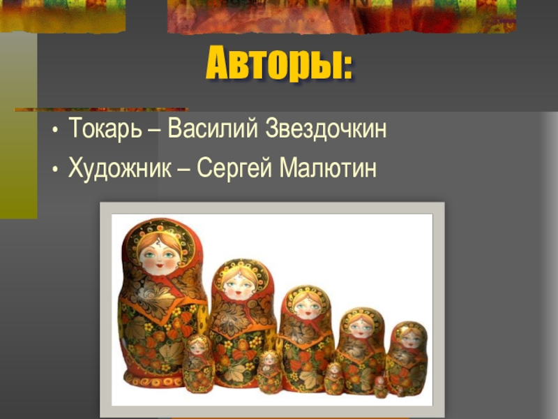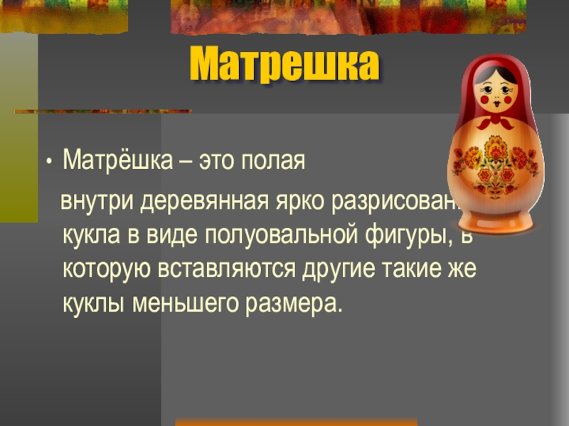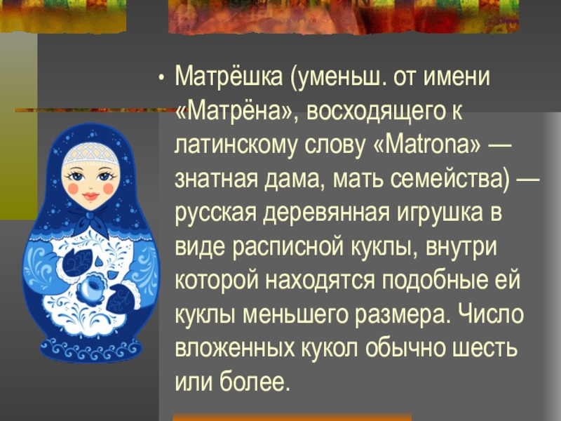 Слайд 3Матрёшка (уменьш. от имени «Матрёна», восходящего к латинскому слову «Matrona» —