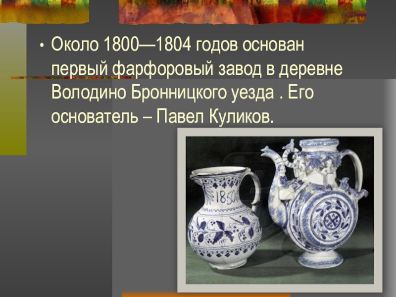 Слайд 16Около 1800—1804 годов основан первый фарфоровый завод в деревне Володино Бронницкого