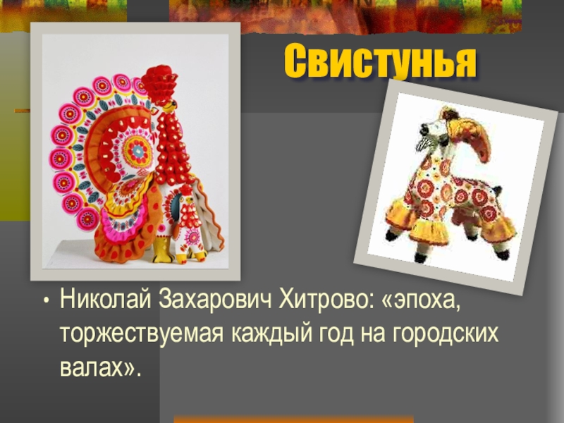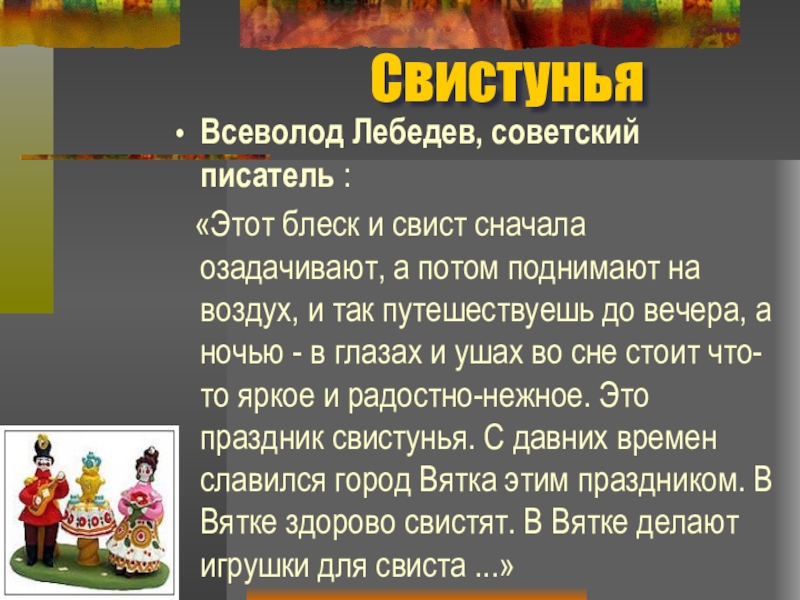 озадачивают, а потом поднимают на воздух, и так путешествуешь до вечера, а ночью - в глазах и ушах во сне стоит что-то яркое и радостно-нежное. Это праздник свистунья. С давних времен славился город Вятка этим праздником. В Вятке здорово свистят. В Вятке делают игрушки для свиста ...»