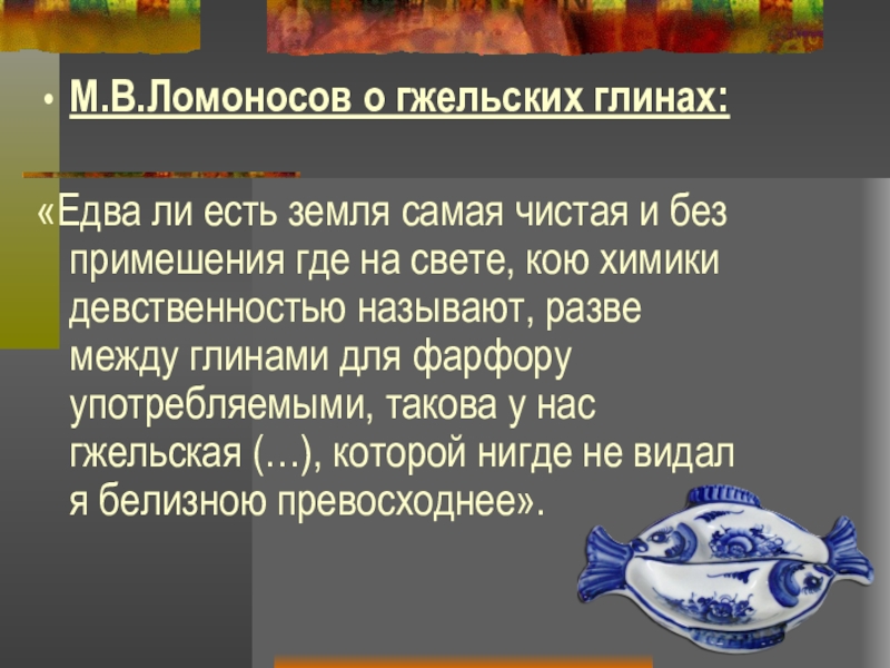 Слайд 13М.В.Ломоносов о гжельских глинах: