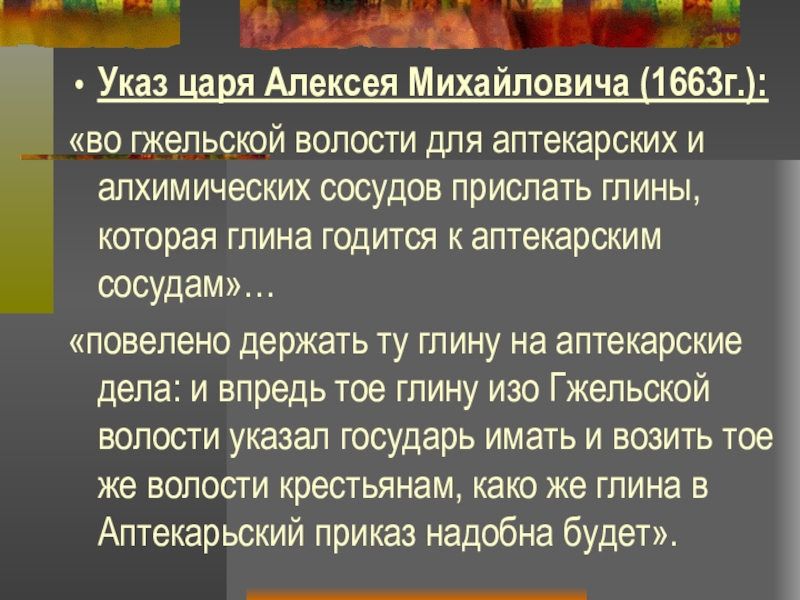 «повелено держать ту глину на аптекарские дела: и впредь тое глину изо Гжельской волости указал государь имать и возить тое же волости крестьянам, како же глина в Аптекарьский приказ надобна будет».