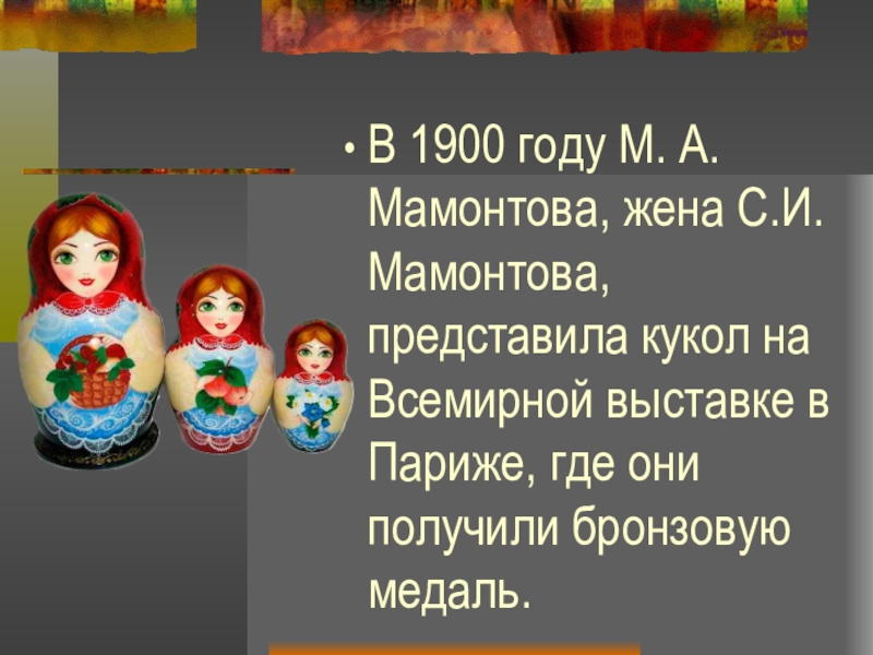 Слайд 9В 1900 году М. А. Мамонтова, жена С.И. Мамонтова, представила кукол