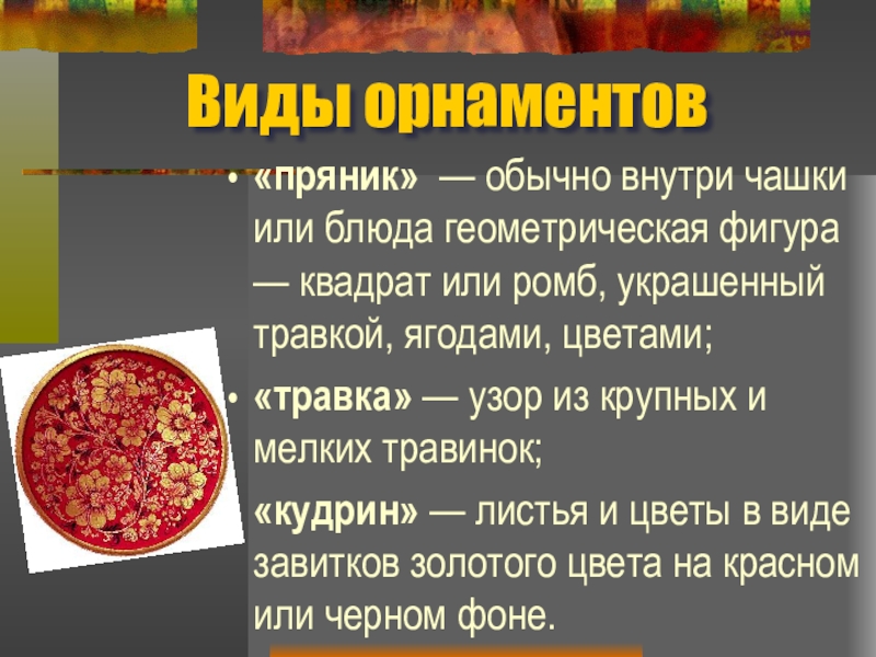 «кудрин» — листья и цветы в виде завитков золотого цвета на красном или черном фоне.