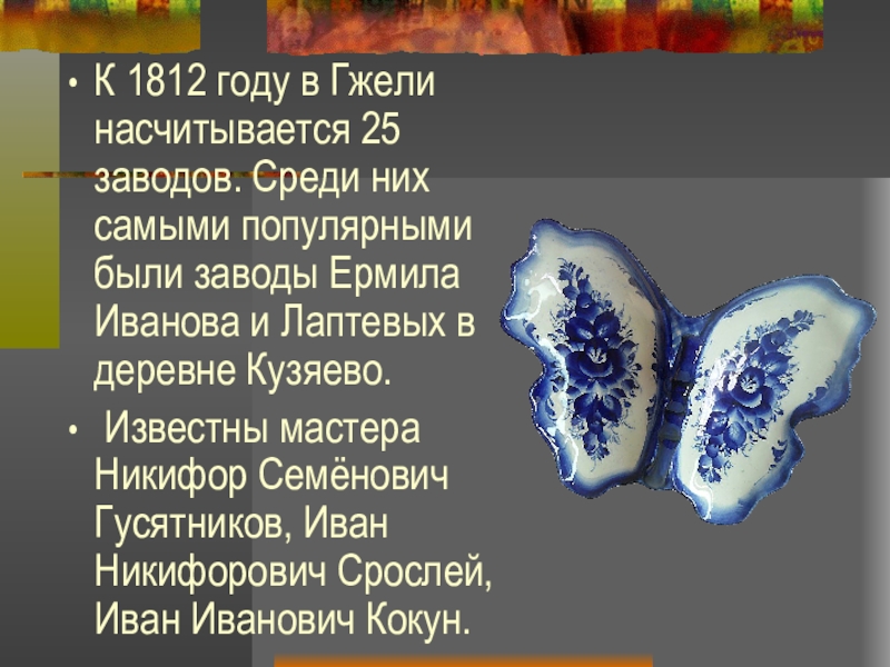 Слайд 14К 1812 году в Гжели насчитывается 25 заводов. Среди них самыми