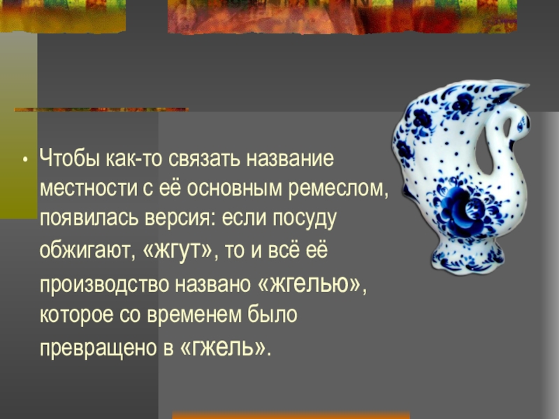 если посуду обжигают, «жгут», то и всё её производство названо «жгелью», которое со временем было превращено в «гжель».