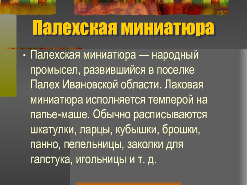 Палехская миниатюра — народный промысел, развившийся в поселке Палех Ивановской области.
