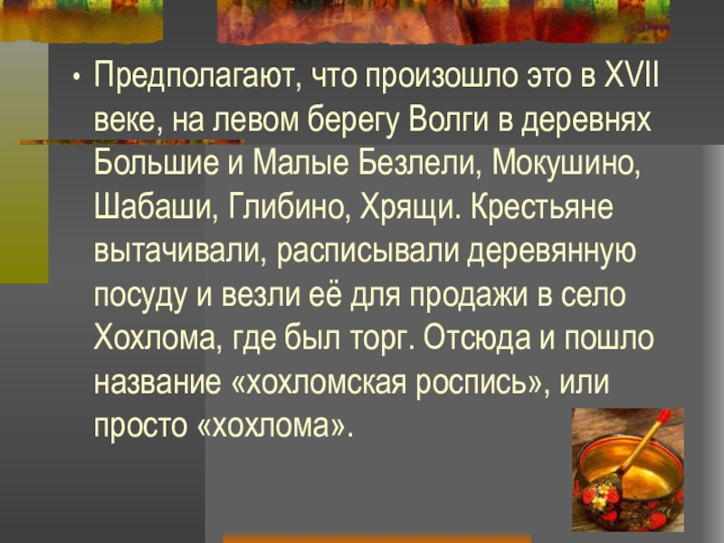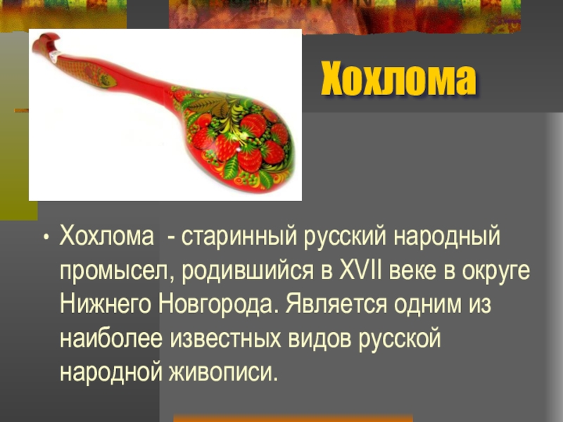 Хохлома - старинный русский народный промысел, родившийся в XVII веке в