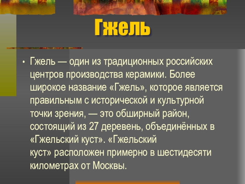 Гжель — один из традиционных российских центров производства керамики. Более широкое название