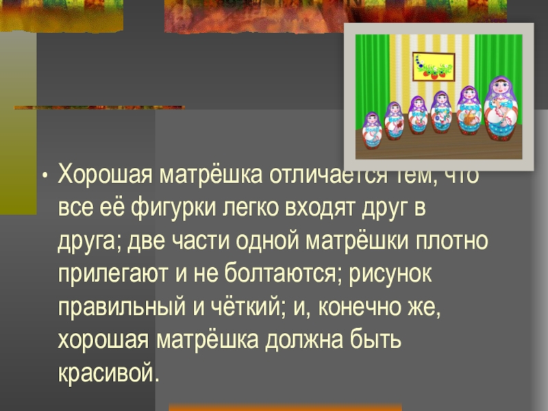 Слайд 8Хорошая матрёшка отличается тем, что все её фигурки легко входят друг