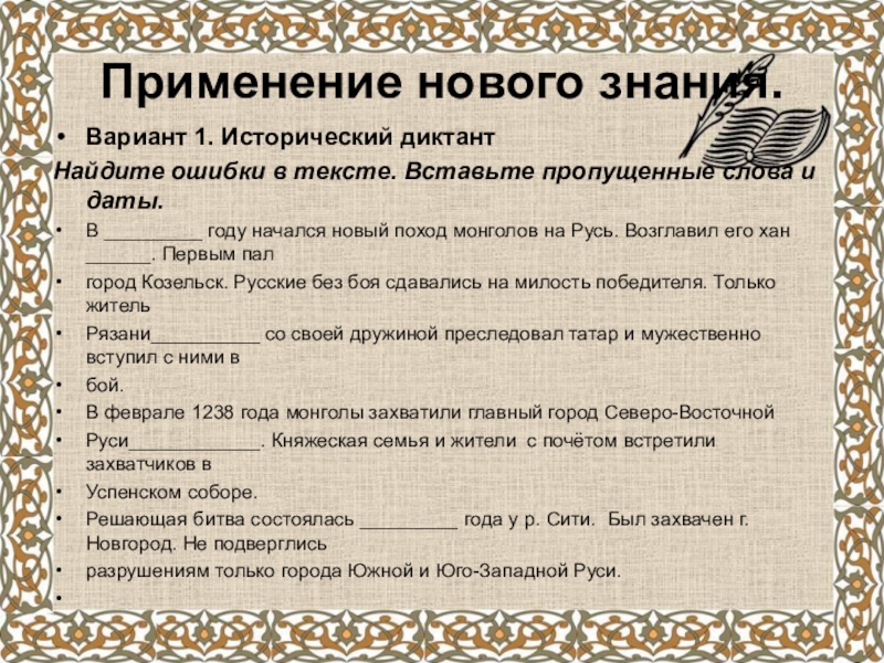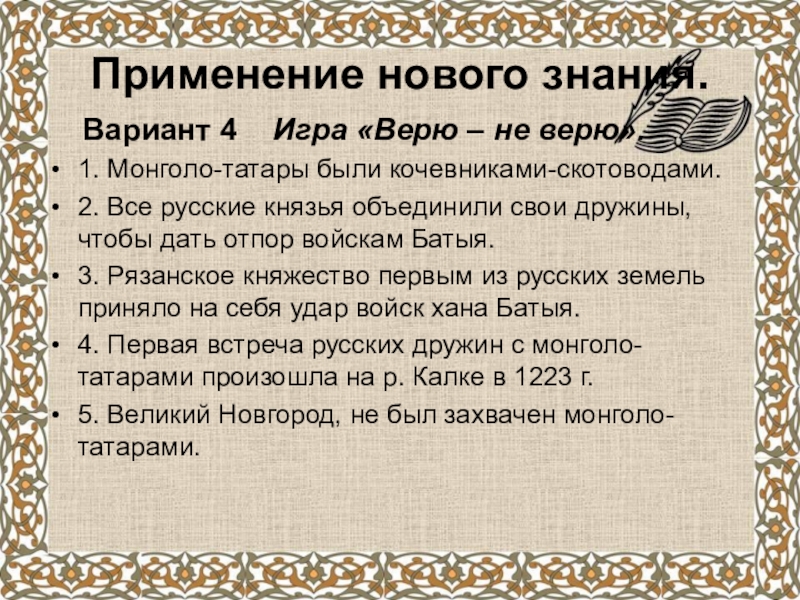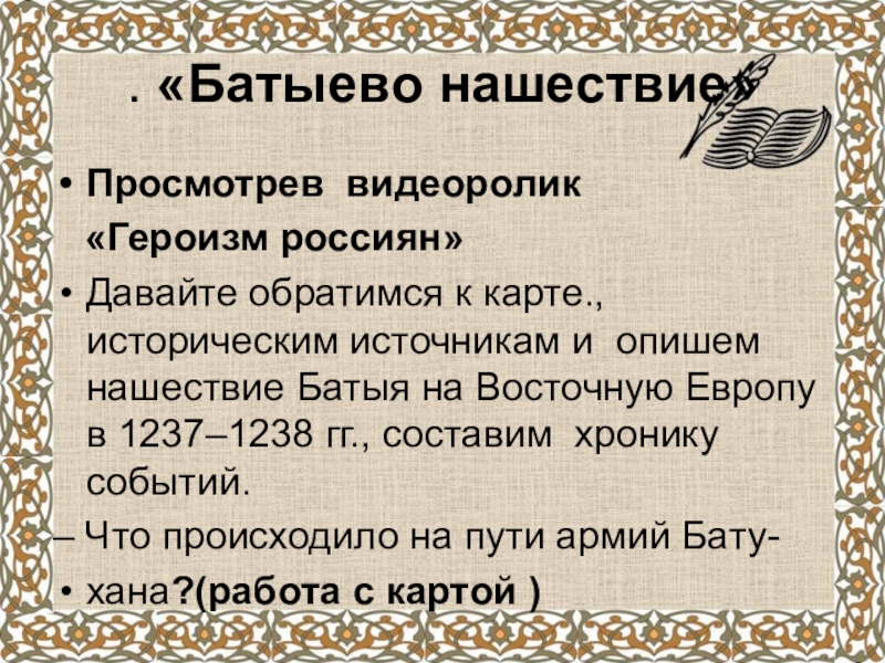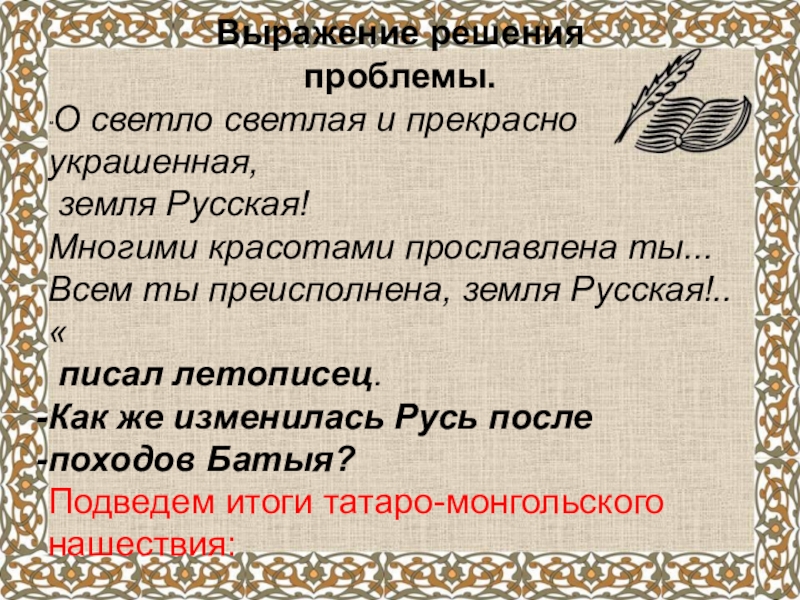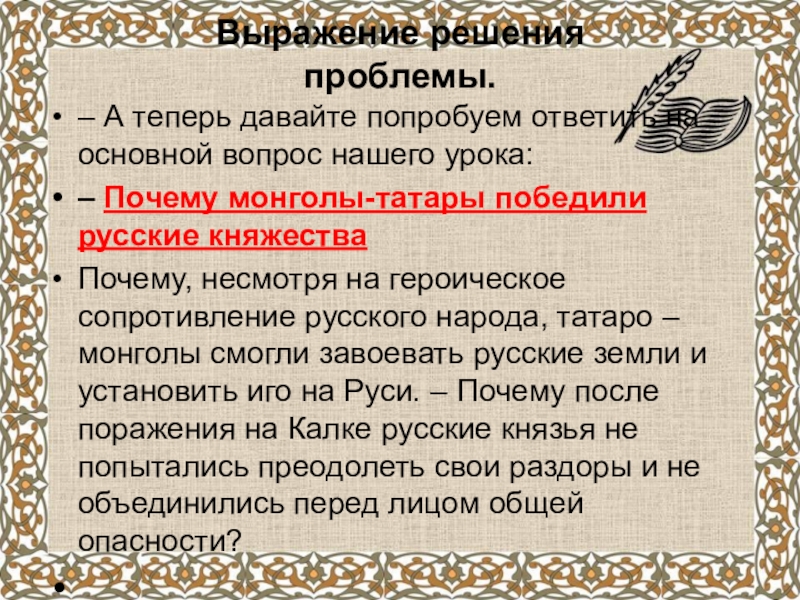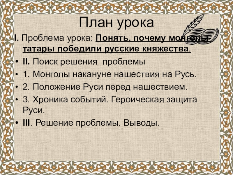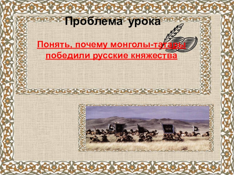 I. Проблема урока: Понять, почему монголы-татары победили русские княжества.