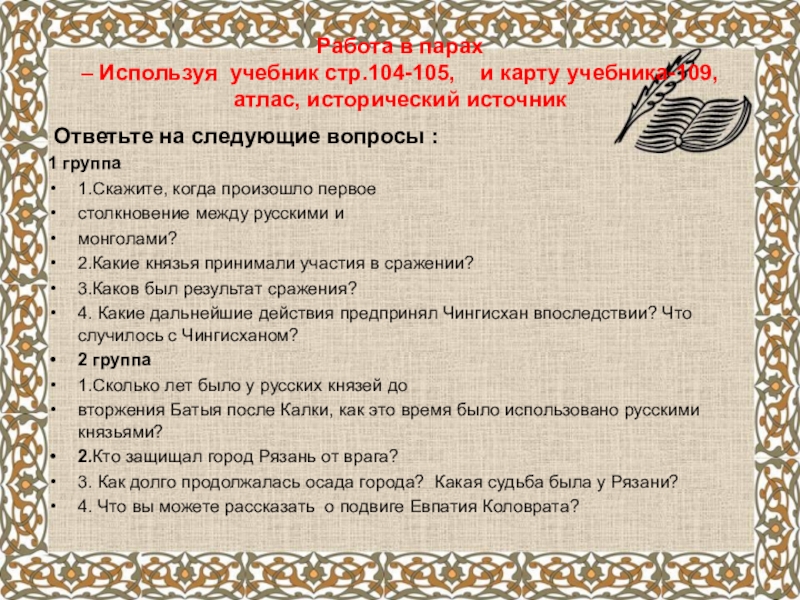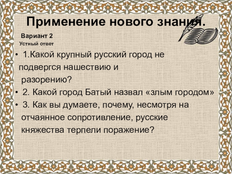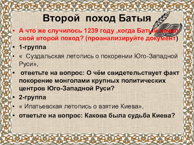 Почему, несмотря на героическое сопротивление русского народа, татаро – монголы смогли завоевать русские земли и установить иго на Руси. – Почему после поражения на Калке русские князья не попытались преодолеть свои раздоры и не объединились перед лицом общей опасности?