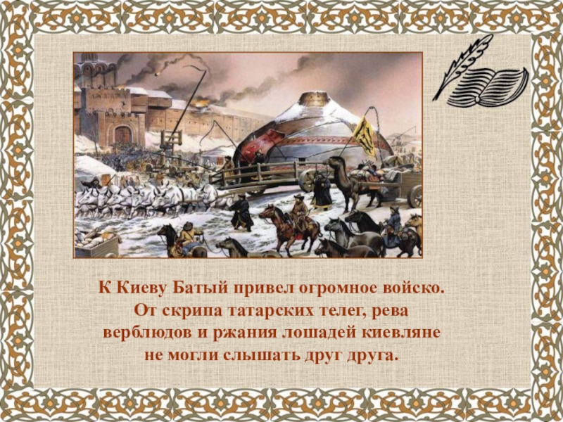Слайд 35К Киеву Батый привел огромное войско. От скрипа татарских телег, рева