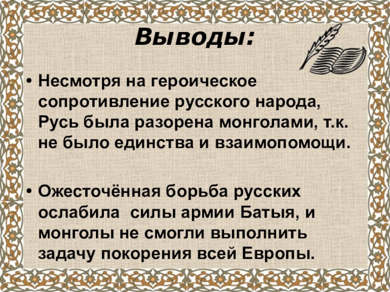 Несмотря на героическое сопротивление русского народа, Русь была разорена монголами, т.к.