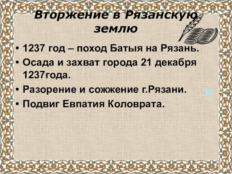 3. Рязанское княжество первым из русских земель приняло на себя удар войск хана Батыя.