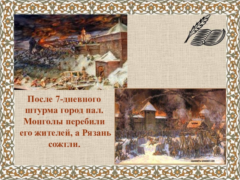 Слайд 18После 7-дневного штурма город пал. Монголы перебили его жителей, а Рязань