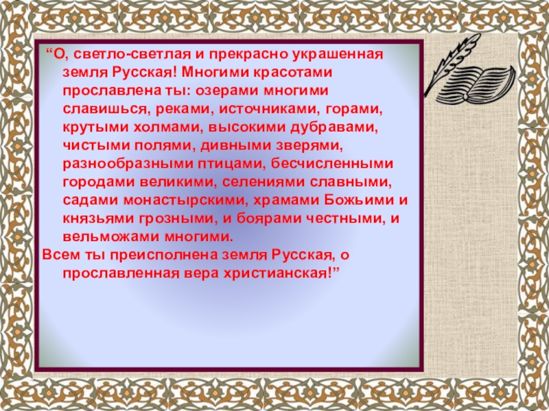 Слайд 1 “О, светло-светлая и прекрасно украшенная земля Русская! Многими красотами прославлена
