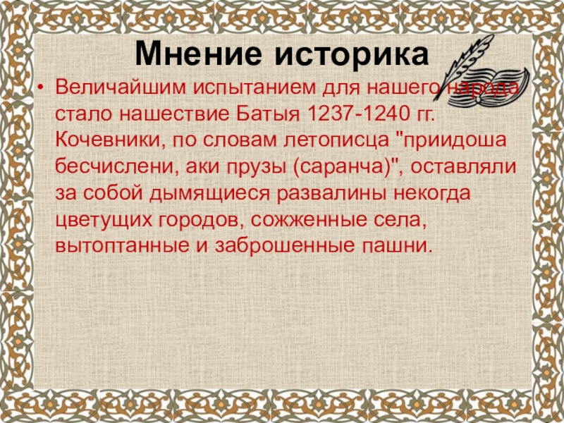Величайшим испытанием для нашего народа стало нашествие Батыя 1237-1240 гг.