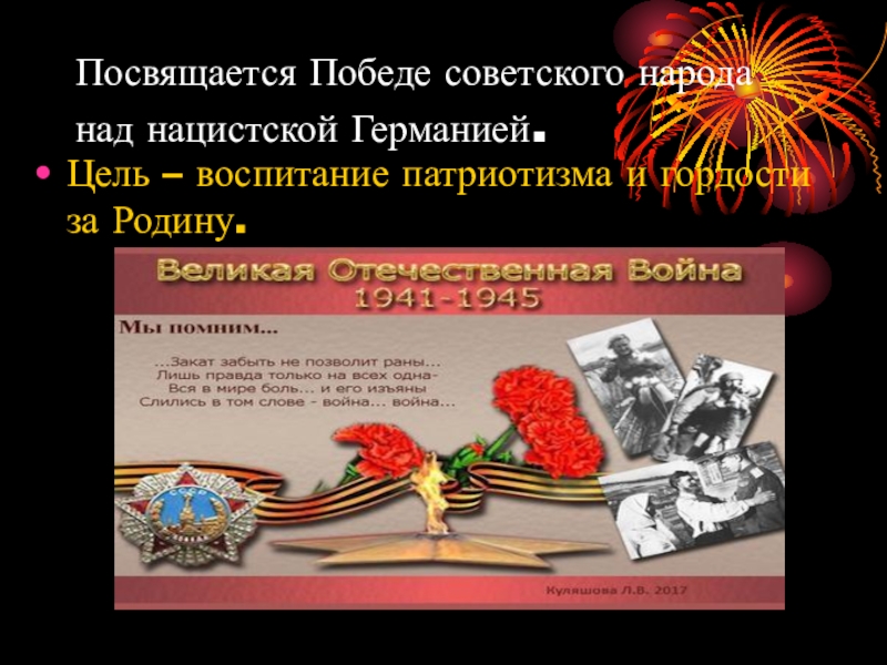 Посвящается Победе советского народа над нацистской Германией.Цель – воспитание патриотизма и гордости за Родину.