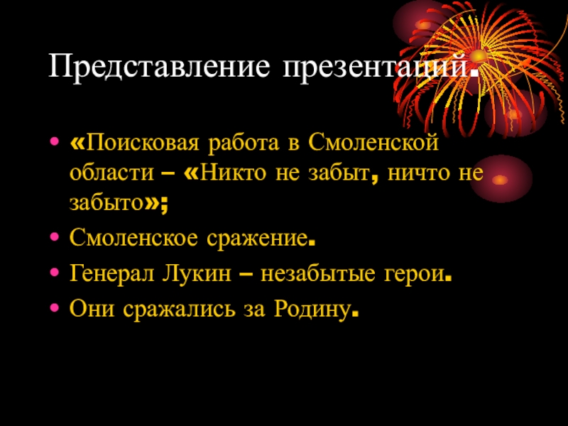Представление презентаций.«Поисковая работа в Смоленской области – «Никто не забыт, ничто не забыто»;Смоленское сражение.Генерал Лукин – незабытые
