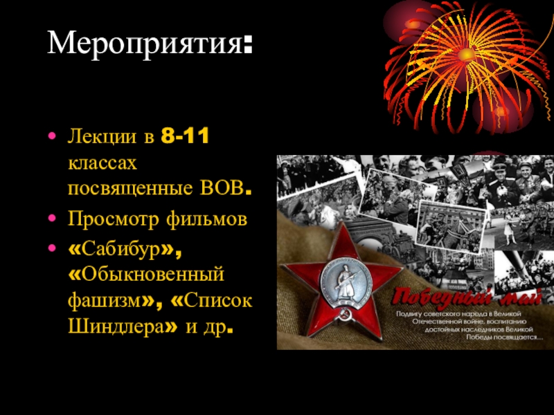 Мероприятия:Лекции в 8-11 классах посвященные ВОВ.Просмотр фильмов«Сабибур», «Обыкновенный фашизм», «Список Шиндлера» и др.