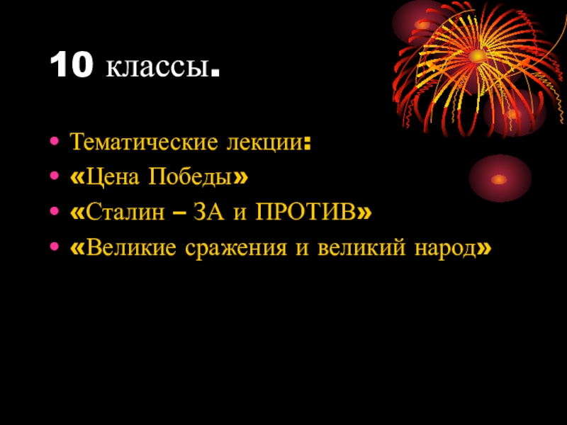 10 классы.Тематические лекции:«Цена Победы»«Сталин – ЗА и ПРОТИВ»«Великие сражения и великий народ»