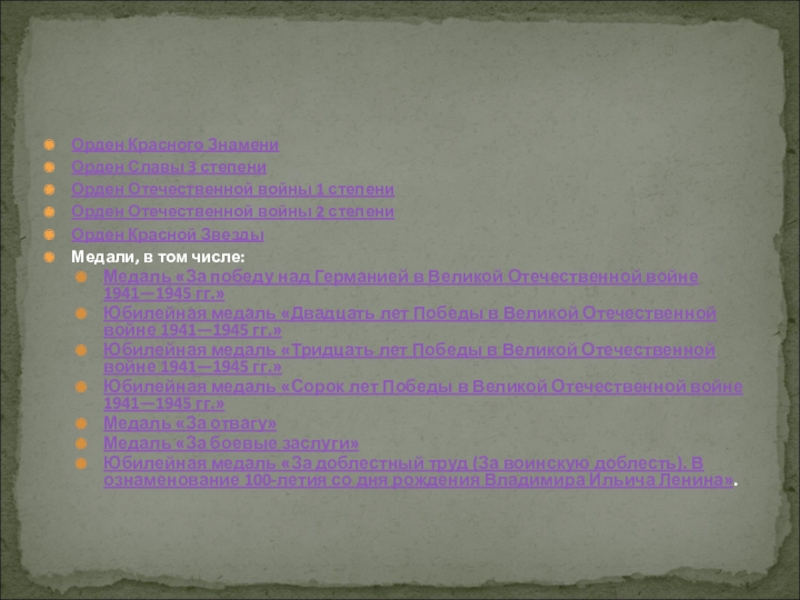 Орден Красного Знамени Орден Славы 3 степени Орден Отечественной войны 1 степени Орден Отечественной войны 2 степени