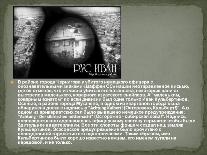 Презентация, доклад О ЛЕГЕНДАРНОМ СНАЙПЕРЕ ИВАНЕ КУЛЬБЕРТИНОВЕ