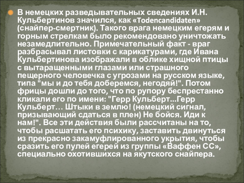 Слайд 7В немецких разведывательных сведениях И.Н. Кульбертинов значился, как «Todencandidaten»(снайпер-смертник). Такого врага