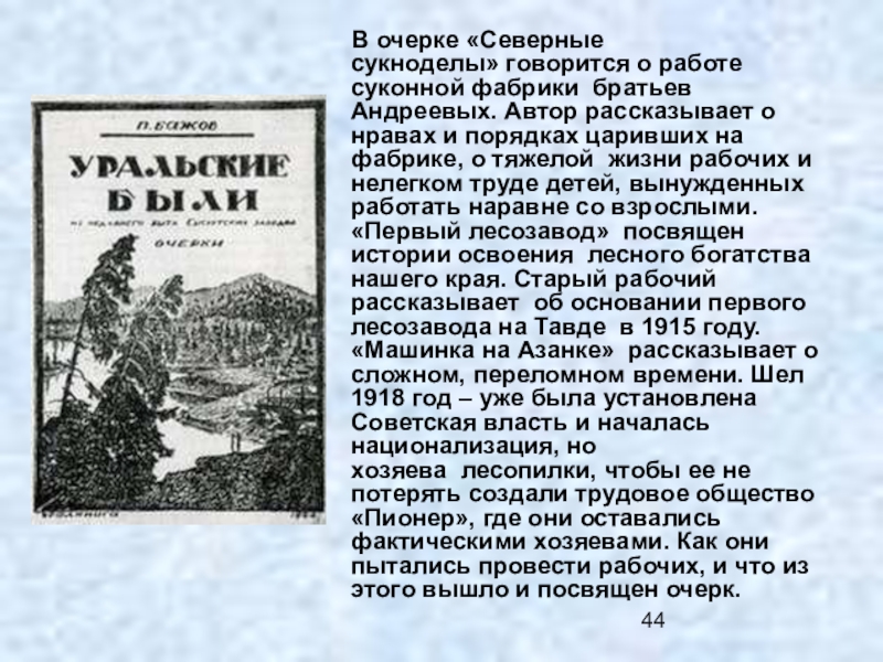 Слайд 44 В очерке «Северные сукноделы» говорится о работе суконной фабрики
