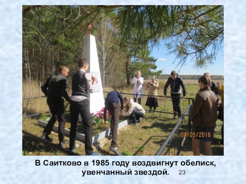 Слайд 23В Саитково в 1985 году воздвигнут обелиск, увенчанный звездой.