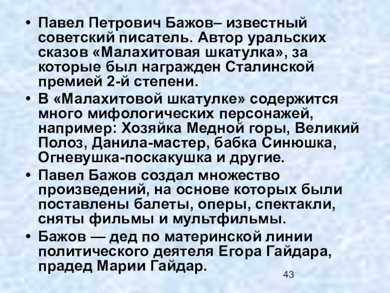 Слайд 43Павел Петрович Бажов– известный советский писатель. Автор уральских сказов «Малахитовая шкатулка»,
