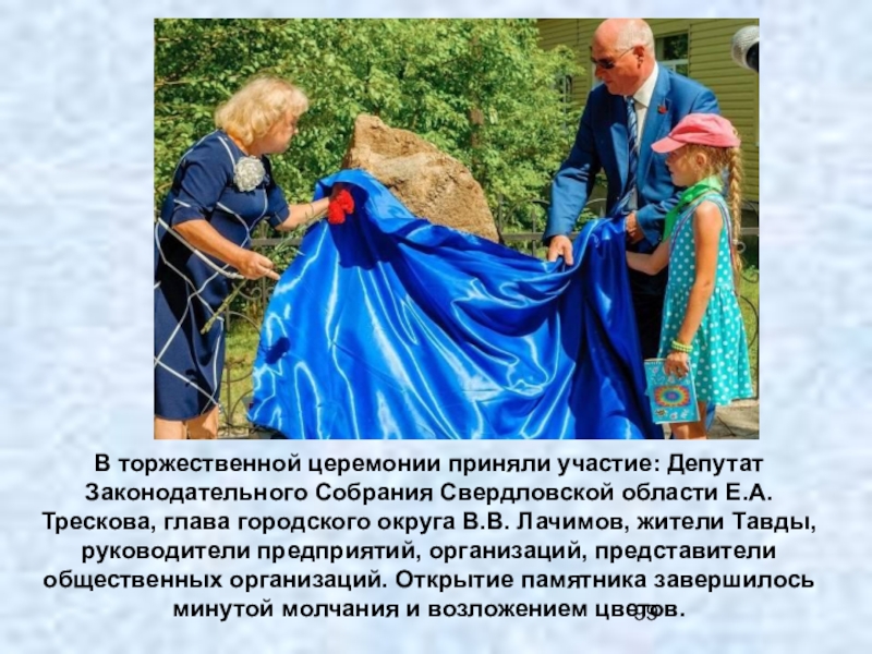 Трескова, глава городского округа В.В. Лачимов, жители Тавды, руководители предприятий, организаций, представители общественных организаций. Открытие памятника завершилось минутой молчания и возложением цветов.