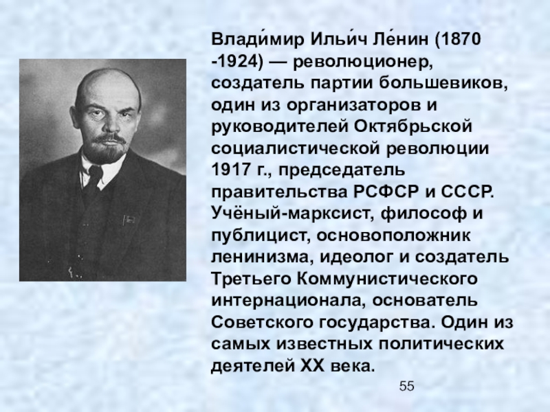 Слайд 55Влади́мир Ильи́ч Ле́нин (1870 -1924) — революционер, создатель партии большевиков, один