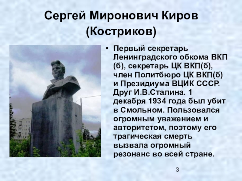 ВКП(б), член Политбюро ЦК ВКП(б) и Президиума ВЦИК СССР. Друг И.В.Сталина. 1 декабря 1934 года был убит в Смольном. Пользовался огромным уважением и авторитетом, поэтому его трагическая смерть вызвала огромный резонанс во всей стране.