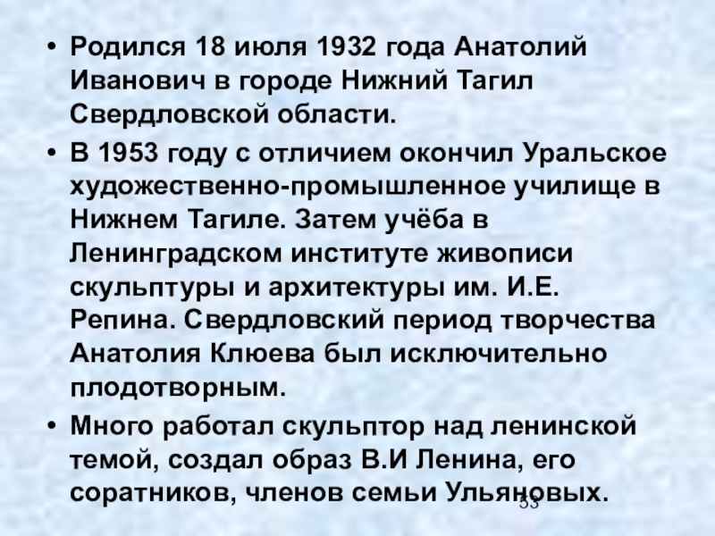 Слайд 53Родился 18 июля 1932 года Анатолий Иванович в городе Нижний Тагил