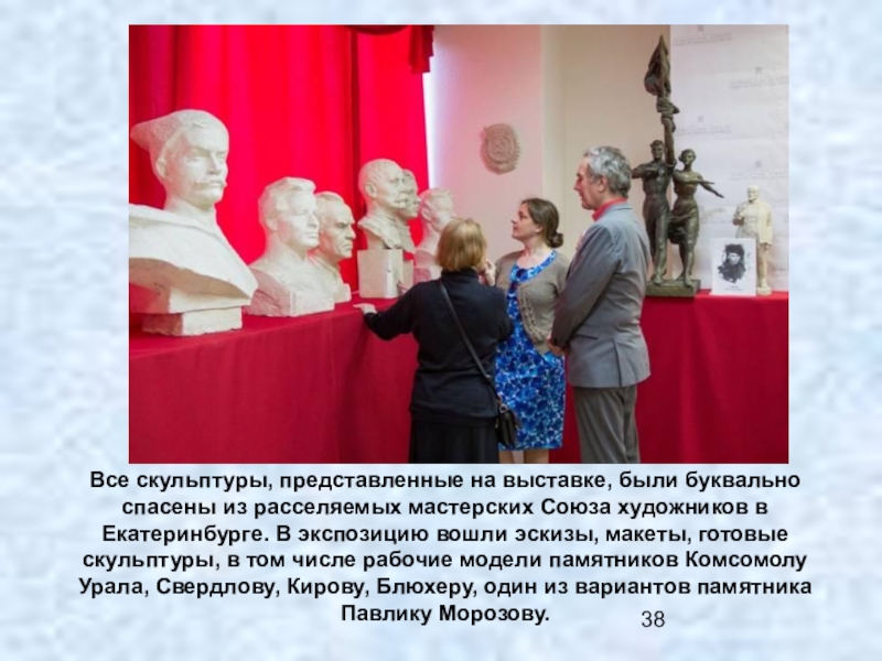 Слайд 38Все скульптуры, представленные на выставке, были буквально спасены из расселяемых мастерских Союза