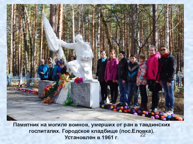 Слайд 22Памятник на могиле воинов, умерших от ран в тавдинских госпиталях. Городское