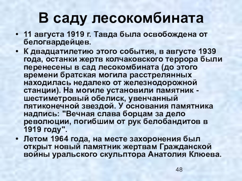 Слайд 57Первый памятник Ленину в городе Тавде был установлен в саду лесокомбината