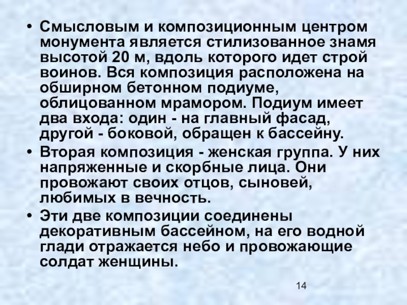Слайд 14Смысловым и композиционным центром монумента является стилизованное знамя высотой 20 м,