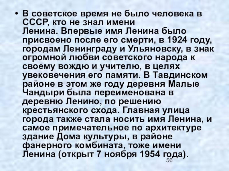 имени Ленина. Впервые имя Ленина было присвоено после его смерти, в 1924 году, городам Ленинграду и Ульяновску, в знак огромной любви советского народа к своему вождю и учителю, в целях увековечения его памяти. В Тавдинском районе в этом же году деревня Малые Чандыри была переименована в деревню Ленино, по решению крестьянского схода. Главная улица города также стала носить имя Ленина, и самое примечательное по архитектуре здание Дома культуры, в районе фанерного комбината, тоже имени Ленина (открыт 7 ноября 1954 года).